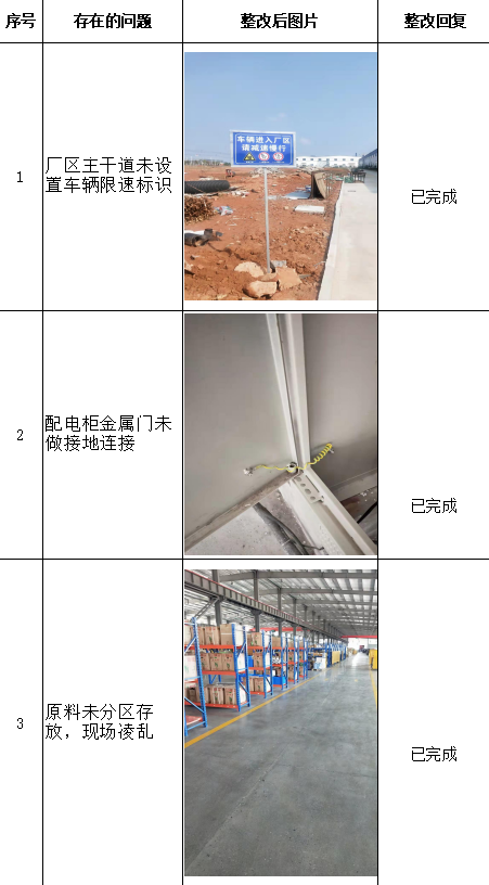發(fā)現(xiàn)的問(wèn)題及安全對(duì)策措施 | 江西沃爾肯智能裝備科技有限公司針對(duì)評(píng)價(jià)組提出的上述問(wèn)題,認(rèn)真研究對(duì)策措施,制定整改計(jì)劃,切實(shí)落實(shí)整改措施,項(xiàng)目評(píng)價(jià)過(guò)程中發(fā)現(xiàn)的安全隱患已基本整改到位,整改情況如下表: